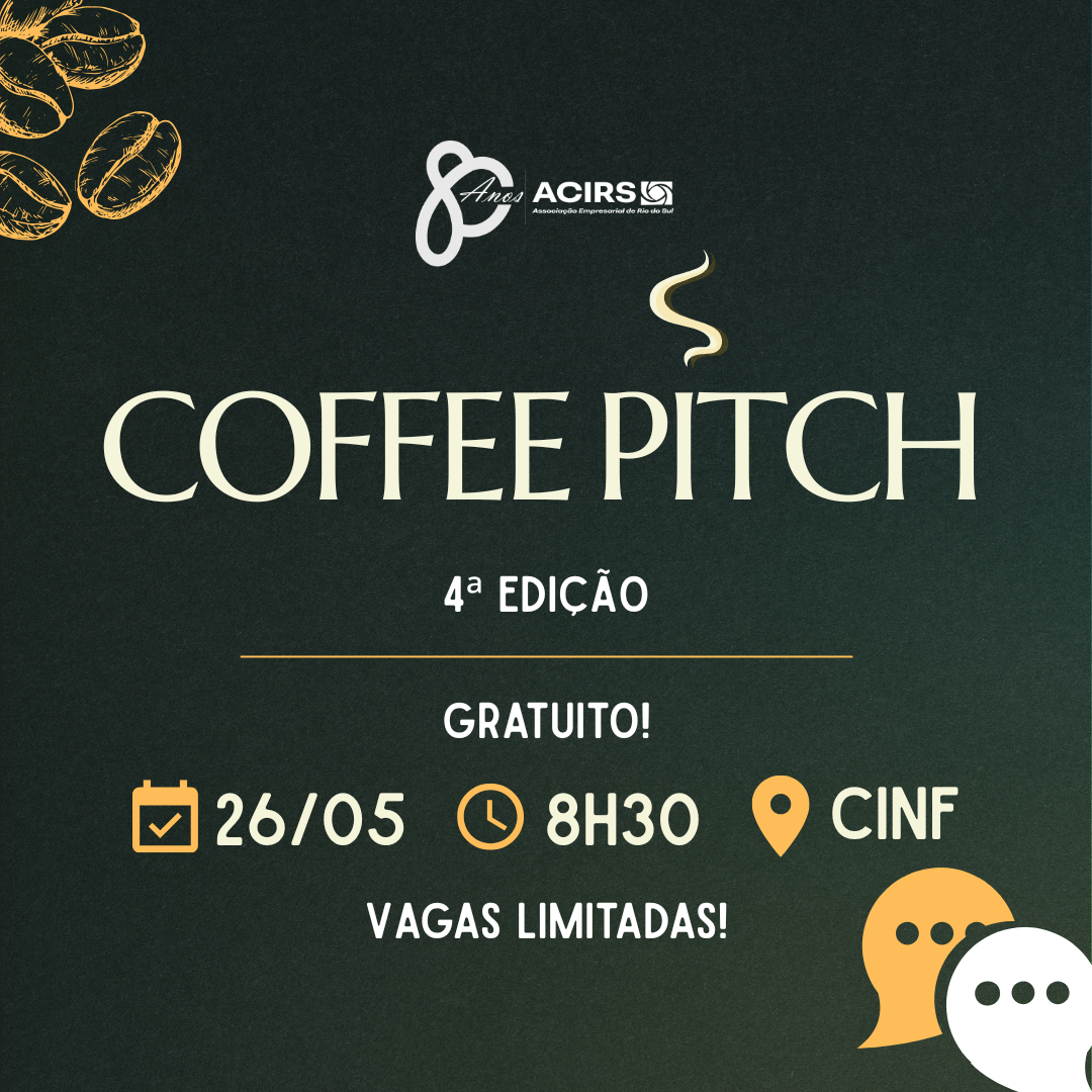 Como transformar uma conversa de poucos minutos em uma oportunidade real de negócios? Essa é a proposta da 4ª edição do Coffee Pitch, promovido pela ACIRS – Associação Empresarial de Rio do Sul, que acontece no dia 26 de maio, às 8h30. Gratuito e aberto ao público, o encontro convida empresários, empresárias e empreendedores a aprimorarem suas habilidades de comunicação e networking.